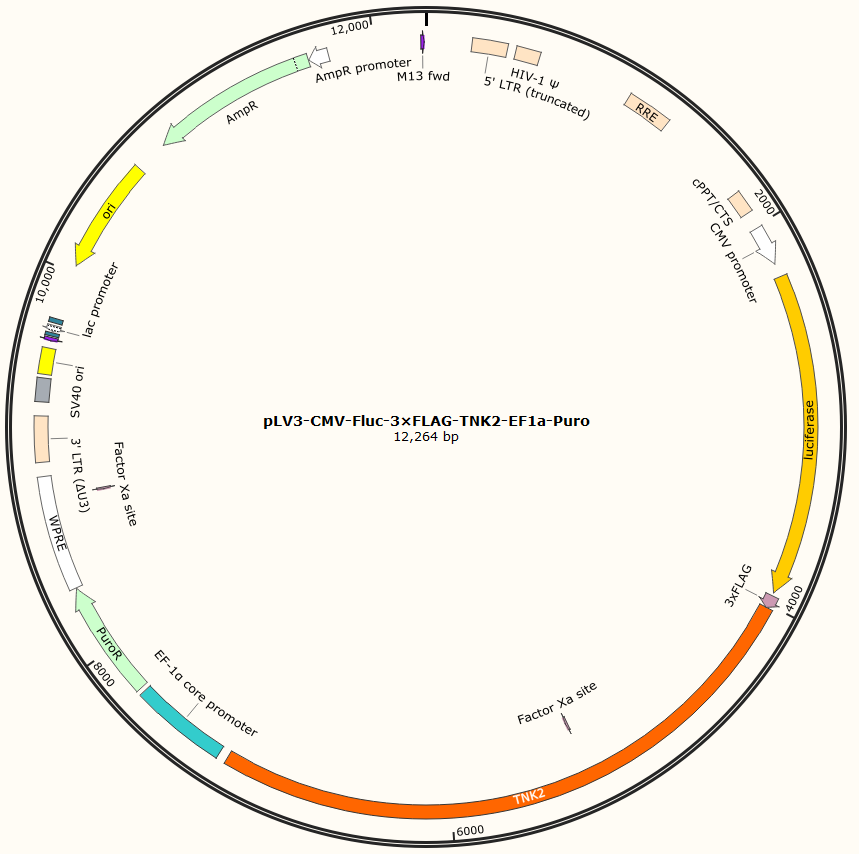 | GC020400972 | pLV3-CMV-Fluc-3×FLAG-TNK2-EF1a-Puro | 2μg | TNK2基因过表达 | 800.00 | 2-3天 |