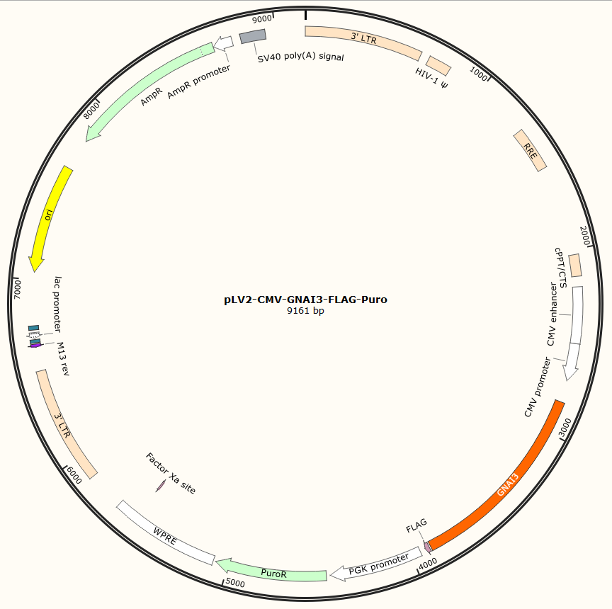 pLV2-CMV-GNAI3-FLAG-Puro是以基恩科生物自研慢病毒骨架载体pLV2-CMV-MCS-FLAG-Puro为骨架载体构建,过表达小鼠GNAI3基因,与载体PMD2.G和Pspax2配套进行慢病毒包装。