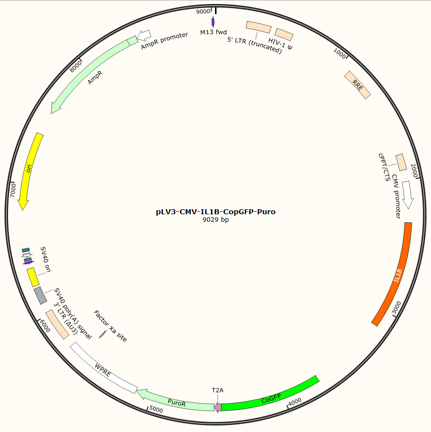 pLV3-CMV-IL1B-CopGFP-Puro是以基恩科生物自研慢病毒骨架载体pLV3-CMV-MCS-CopGFP-Puro为骨架载体构建,过表达小鼠IL1B基因,与载体PMD2.G和Pspax2配套进行慢病毒包装。
