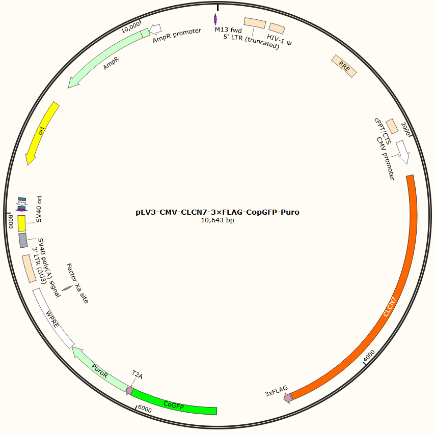 pLV3-CMV-CLCN7-3×FLAG-CopGFP-Puro是以基恩科生物自研慢病毒骨架载体pLV3-CMV-MCS-3×FLAG-CopGFP-Puro为骨架载体构建,过表达小鼠CLCN7基因,与载体PMD2.G和Pspax2配套进行慢病毒包装。