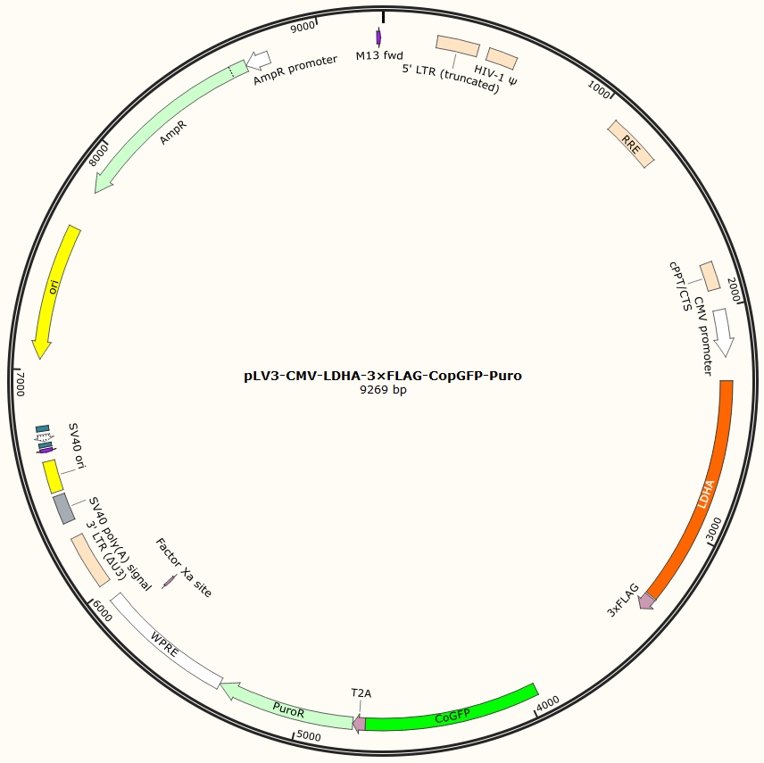pLV3-CMV-LDHA-3×FLAG-CopGFP-Puro是以基恩科生物自研慢病毒骨架载体pLV3-CMV-MCS-3×FLAG-CopGFP-Puro为骨架载体构建,过表达小鼠LDHA基因,与载体PMD2.G和Pspax2配套进行慢病毒包装。