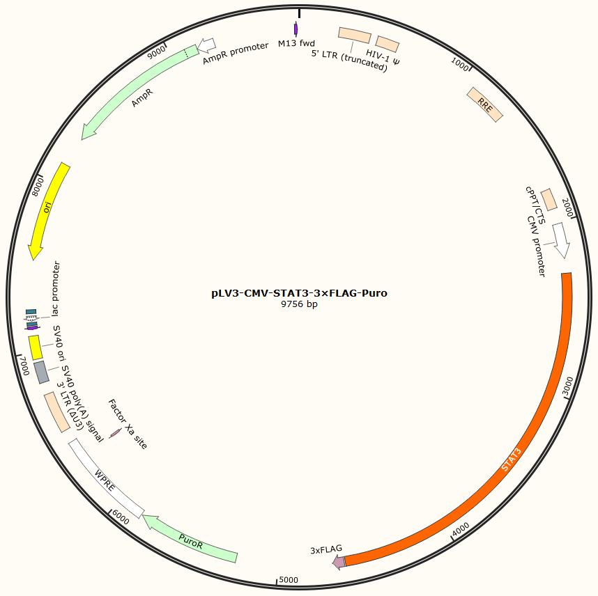 pLV3-CMV-STAT3-3×FLAG-Puro是以基恩科生物自研慢病毒骨架载体pLV3-CMV-MCS-3×FLAG-Puro为骨架载体构建,过表达小鼠STAT3基因,与载体PMD2.G和Pspax2配套进行慢病毒包装。