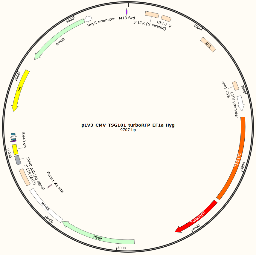pLV3-CMV-TSG101-turboRFP-EF1a-Hyg是以基恩科生物自研慢病毒骨架载体pLV3-CMV-MCS-turboRFP-EF1a-Hyg为骨架载体构建,过表达小鼠TSG101基因,与载体PMD2.G和Pspax2配套进行慢病毒包装。