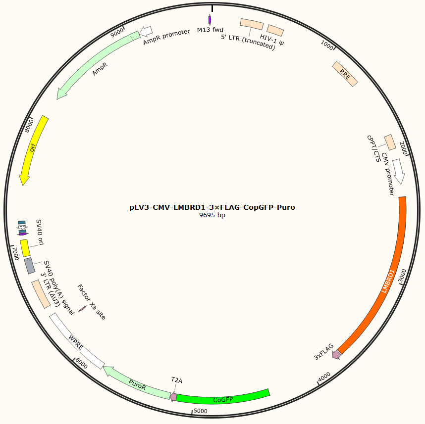 pLV3-CMV-LMBRD1-3×FLAG-CopGFP-Puro是以基恩科生物自研慢病毒骨架载体pLV3-CMV-MCS-3×FLAG-CopGFP-Puro为骨架载体构建,过表达小鼠LMBRD1基因,与载体PMD2.G和Pspax2配套进行慢病毒包装。
