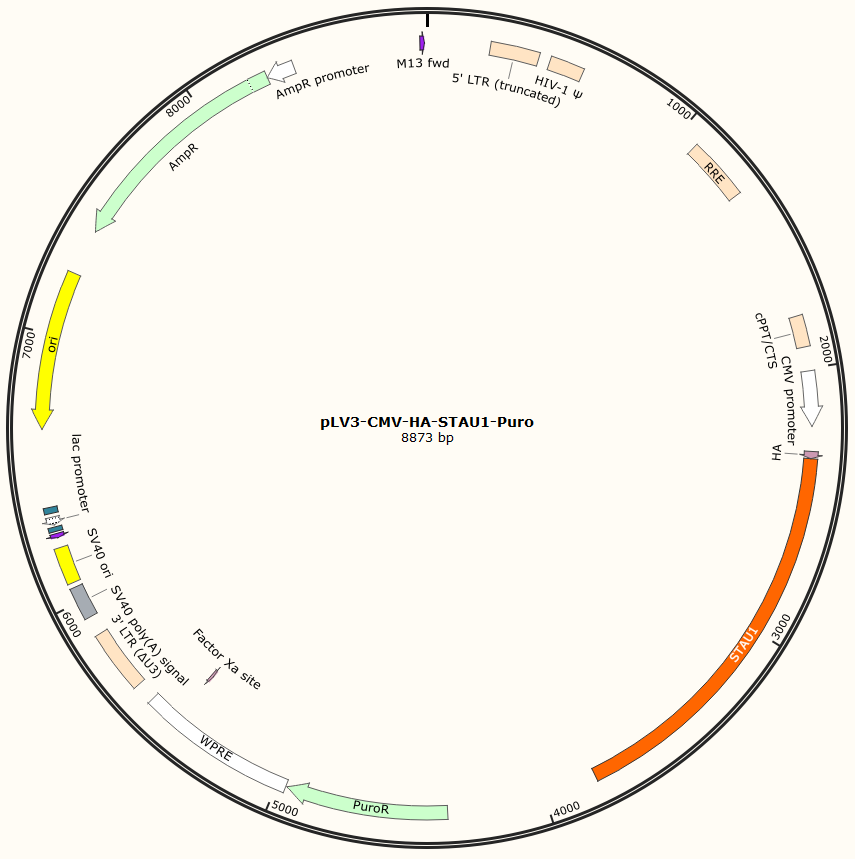pLV3-CMV-HA-STAU1-Puro是以基恩科生物自研慢病毒骨架载体pLV3-CMV-HA-MCS-Puro为骨架载体构建,过表达小鼠STAU1基因,与载体PMD2.G和Pspax2配套进行慢病毒包装。