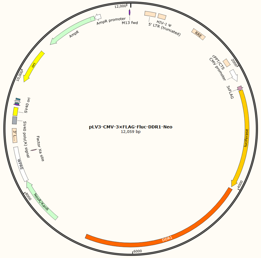 pLV3-CMV-3×FLAG-Fluc-DDR1-Neo是以基恩科生物自研慢病毒骨架载体pLV3-CMV-3×FLAG-Fluc-MCS-Neo为骨架载体构建,过表达小鼠DDR1基因,与载体PMD2.G和Pspax2配套进行慢病毒包装。
