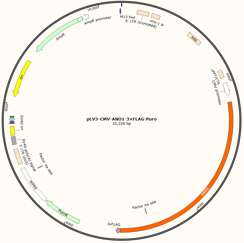 pLV3-CMV-ANO1-3×FLAG-Puro是以基恩科生物自研慢病毒骨架载体pLV3-CMV-MCS-3×FLAG-Puro为骨架载体构建,过表达小鼠ANO1基因,与载体PMD2.G和Pspax2配套进行慢病毒包装。