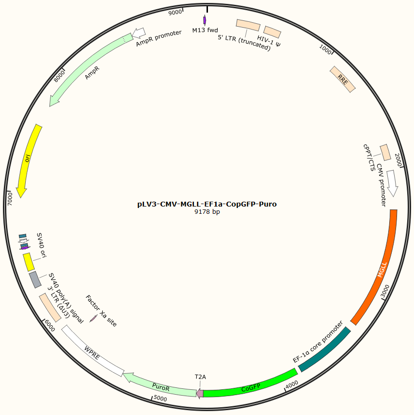 pLV3-CMV-MGLL-EF1a-CopGFP-Puro是以基恩科生物自研慢病毒骨架载体pLV3-CMV-MCS-EF1a-CopGFP-Puro为骨架载体构建,过表达小鼠MGLL基因,与载体PMD2.G和Pspax2配套进行慢病毒包装。