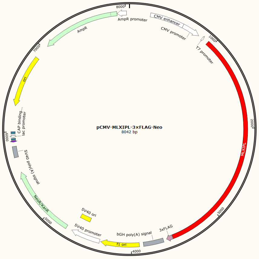 | GC020401035 | pCMV-MLXIPL-3×FLAG-Neo | 2μg | MLXIPL基因过表达 | 800.00 | 2-3天 |