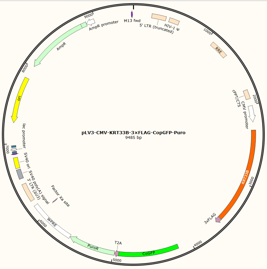 pLV3-CMV-KRT33B-3×FLAG-CopGFP-Puro是以基恩科生物自研慢病毒骨架载体pLV3-CMV-MCS-3×FLAG-CopGFP-Puro为骨架载体构建,过表达小鼠KRT33B基因,与载体PMD2.G和Pspax2配套进行慢病毒包装。