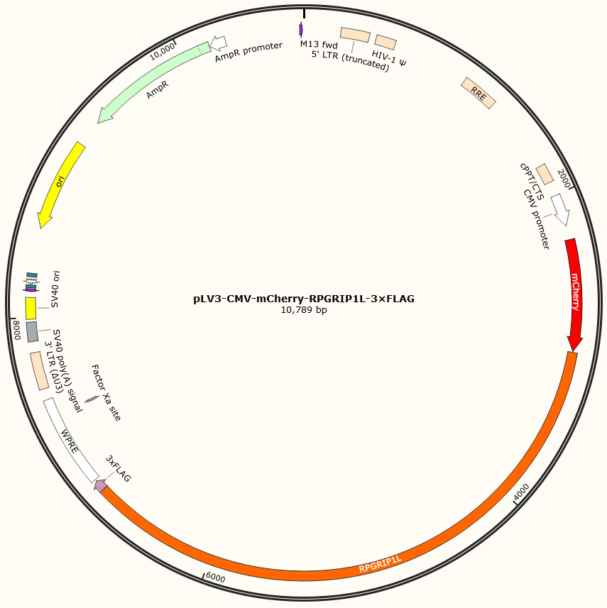 pLV3-CMV-mCherry-RPGRIP1L-3×FLAG是以基恩科生物自研慢病毒骨架载体pLV3-CMV-mCherry-MCS-3×FLAG为骨架载体构建,过表达小鼠RPGRIP1L基因,与载体PMD2.G和Pspax2配套进行慢病毒包装。