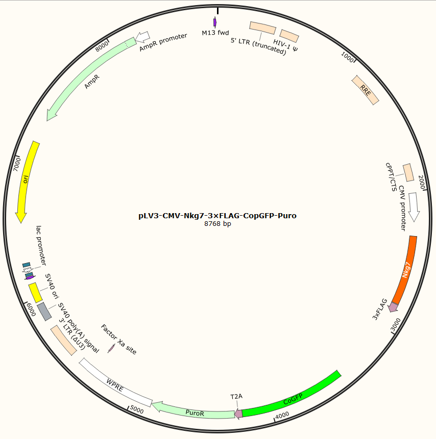 pLV3-CMV-Nkg7-3×FLAG-CopGFP-Puro是以基恩科生物自研慢病毒骨架载体pLV3-CMV-MCS-3×FLAG-CopGFP-Puro为骨架载体构建,过表达小鼠Nkg7基因,与载体PMD2.G和Pspax2配套进行慢病毒包装。