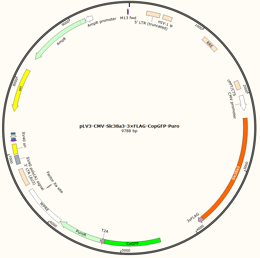 pLV3-CMV-Slc38a3-3×FLAG-CopGFP-Puro是以基恩科生物自研慢病毒骨架载体pLV3-CMV-MCS-3×FLAG-CopGFP-Puro为骨架载体构建,过表达小鼠Slc38a3基因,与载体PMD2.G和Pspax2配套进行慢病毒包装。