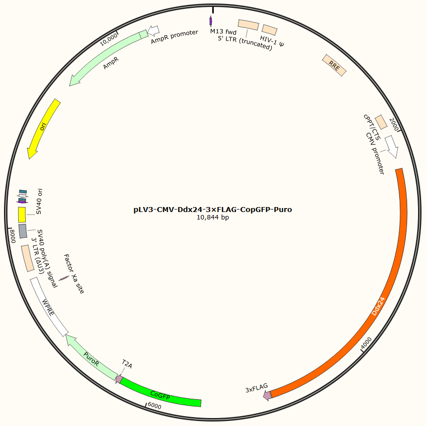 pLV3-CMV-Ddx24-3×FLAG-CopGFP-Puro是以基恩科生物自研慢病毒骨架载体pLV3-CMV-MCS-3×FLAG-CopGFP-Puro为骨架载体构建,过表达小鼠Ddx24基因,与载体PMD2.G和Pspax2配套进行慢病毒包装。