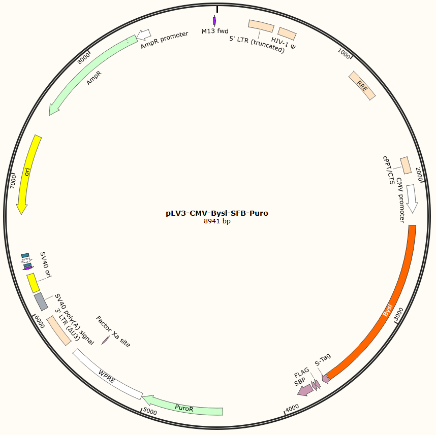 pLV3-CMV-Bysl-SFB-Puro是以基恩科生物自研慢病毒骨架载体pLV3-CMV-MCS-SFB-Puro为骨架载体构建,过表达小鼠Bysl基因,与载体PMD2.G和Pspax2配套进行慢病毒包装。