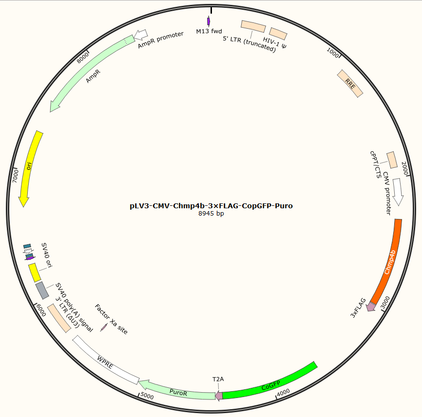 pLV3-CMV-Chmp4b-3×FLAG-CopGFP-Puro是以基恩科生物自研慢病毒骨架载体pLV3-CMV-MCS-3×FLAG-CopGFP-Puro为骨架载体构建,过表达小鼠Chmp4b基因,与载体PMD2.G和Pspax2配套进行慢病毒包装。