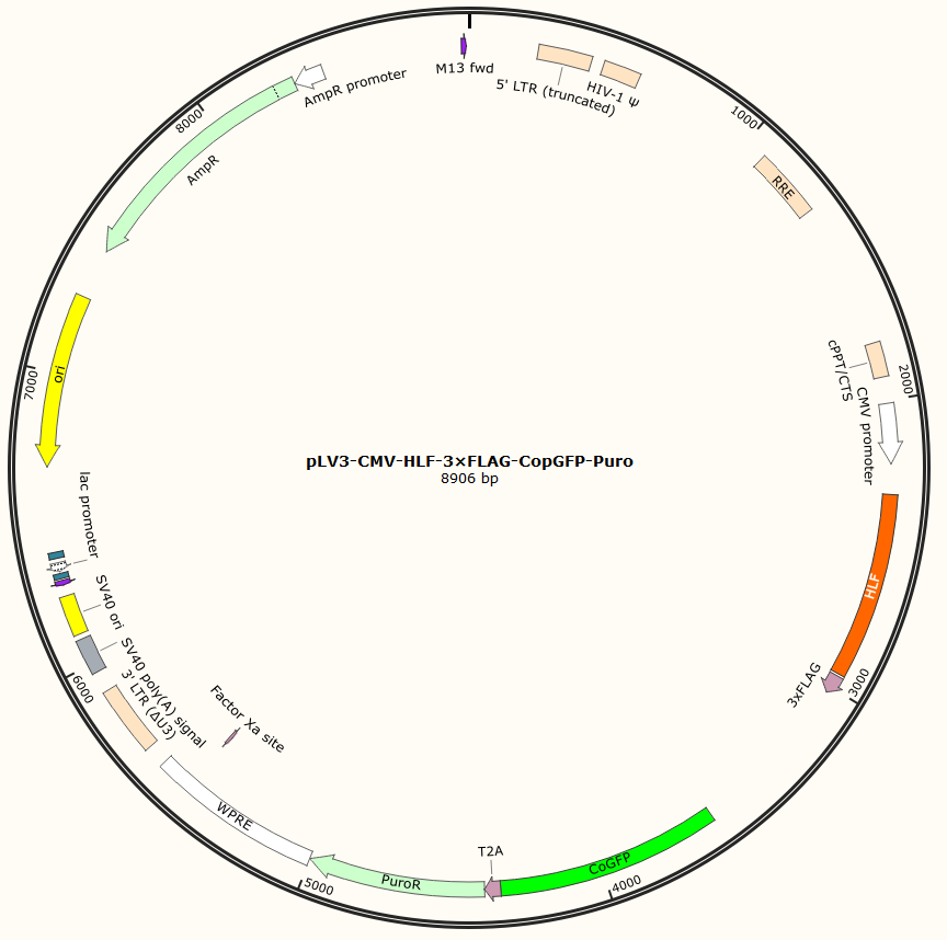 pLV3-CMV-HLF-3×FLAG-CopGFP-Puro是以基恩科生物自研慢病毒骨架载体pLV3-CMV-MCS-3×FLAG-CopGFP-Puro为骨架载体构建,过表达小鼠HLF基因,与载体PMD2.G和Pspax2配套进行慢病毒包装。