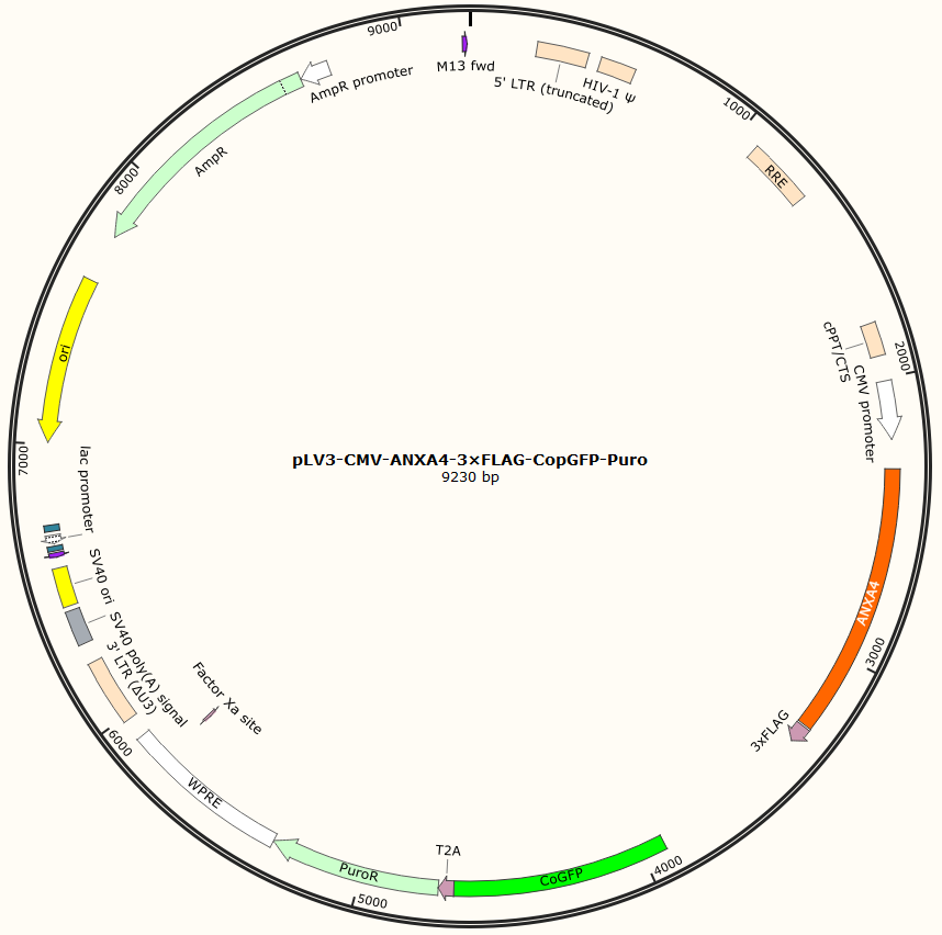 pLV3-CMV-ANXA4-3×FLAG-CopGFP-Puro是以基恩科生物自研慢病毒骨架载体pLV3-CMV-MCS-3×FLAG-CopGFP-Puro为骨架载体构建,过表达小鼠ANXA4基因,与载体PMD2.G和Pspax2配套进行慢病毒包装。