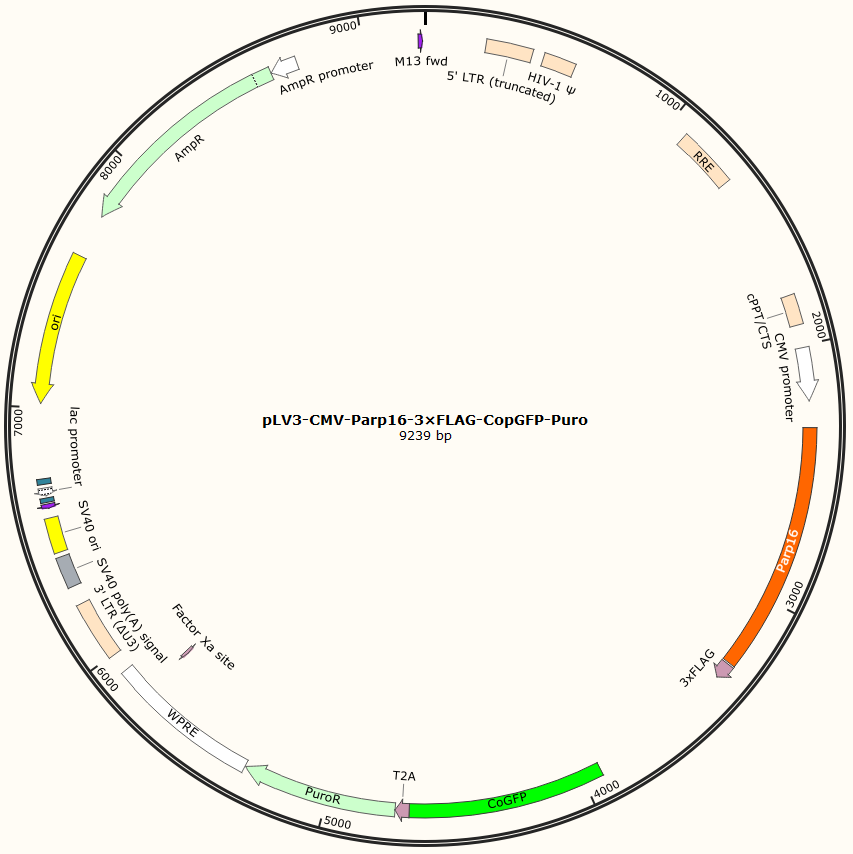 pLV3-CMV-Parp16-3×FLAG-CopGFP-Puro是以基恩科生物自研慢病毒骨架载体pLV3-CMV-MCS-3×FLAG-CopGFP-Puro为骨架载体构建,过表达小鼠Parp16基因,与载体PMD2.G和Pspax2配套进行慢病毒包装。