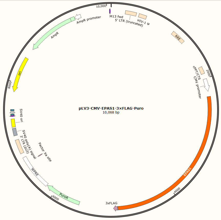 pLV3-CMV-EPAS1-3×FLAG-Puro是以基恩科生物自研慢病毒骨架载体pLV3-CMV-MCS-3×FLAG-Puro为骨架载体构建,过表达小鼠EPAS1基因,与载体PMD2.G和Pspax2配套进行慢病毒包装。