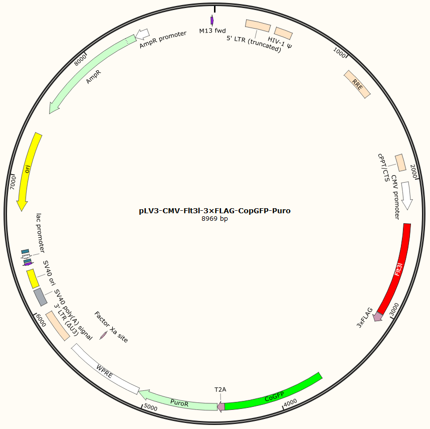 pLV3-CMV-Flt3l-3×FLAG-CopGFP-Puro是以基恩科生物自研慢病毒骨架载体pLV3-CMV-MCS-3×FLAG-CopGFP-Puro为骨架载体构建,过表达小鼠Flt3l基因,与载体PMD2.G和Pspax2配套进行慢病毒包装。