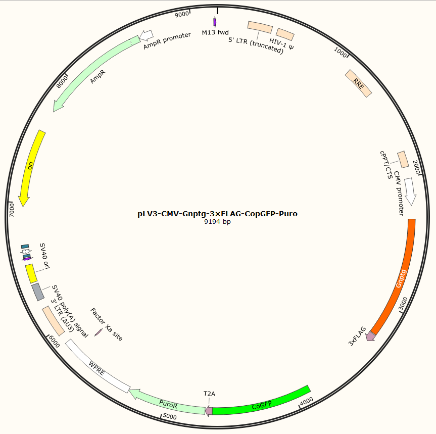 pLV3-CMV-Gnptg-3×FLAG-CopGFP-Puro是以基恩科生物自研慢病毒骨架载体pLV3-CMV-MCS-3×FLAG-CopGFP-Puro为骨架载体构建,过表达小鼠Gnptg基因,与载体PMD2.G和Pspax2配套进行慢病毒包装。