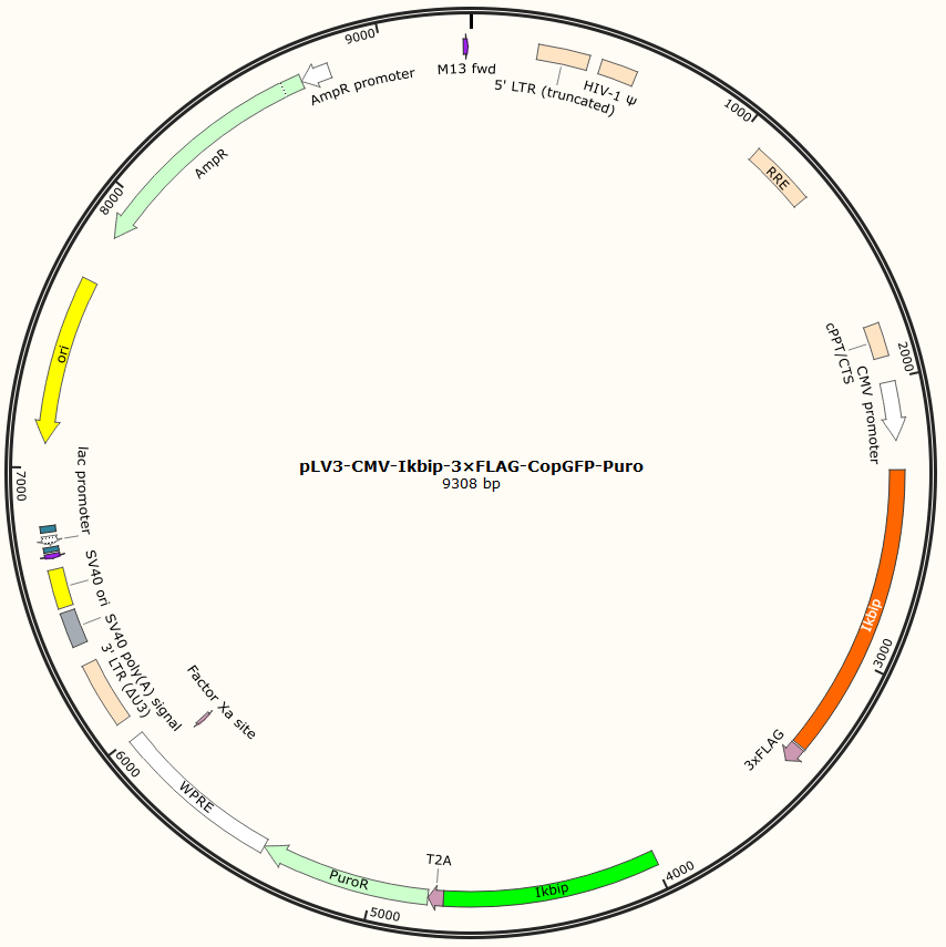 pLV3-CMV-Ikbip-3×FLAG-CopGFP-Puro是以基恩科生物自研慢病毒骨架载体pLV3-CMV-MCS-3×FLAG-CopGFP-Puro为骨架载体构建,过表达小鼠Ikbip基因,与载体PMD2.G和Pspax2配套进行慢病毒包装。