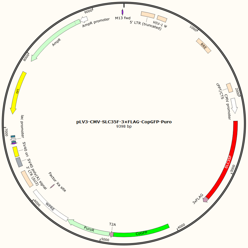 pLV3-CMV-SLC35F-3×FLAG-CopGFP-Puro是以基恩科生物自研慢病毒骨架载体pLV3-CMV-MCS-3×FLAG-CopGFP-Puro为骨架载体构建,过表达小鼠SLC35F基因,与载体PMD2.G和Pspax2配套进行慢病毒包装。