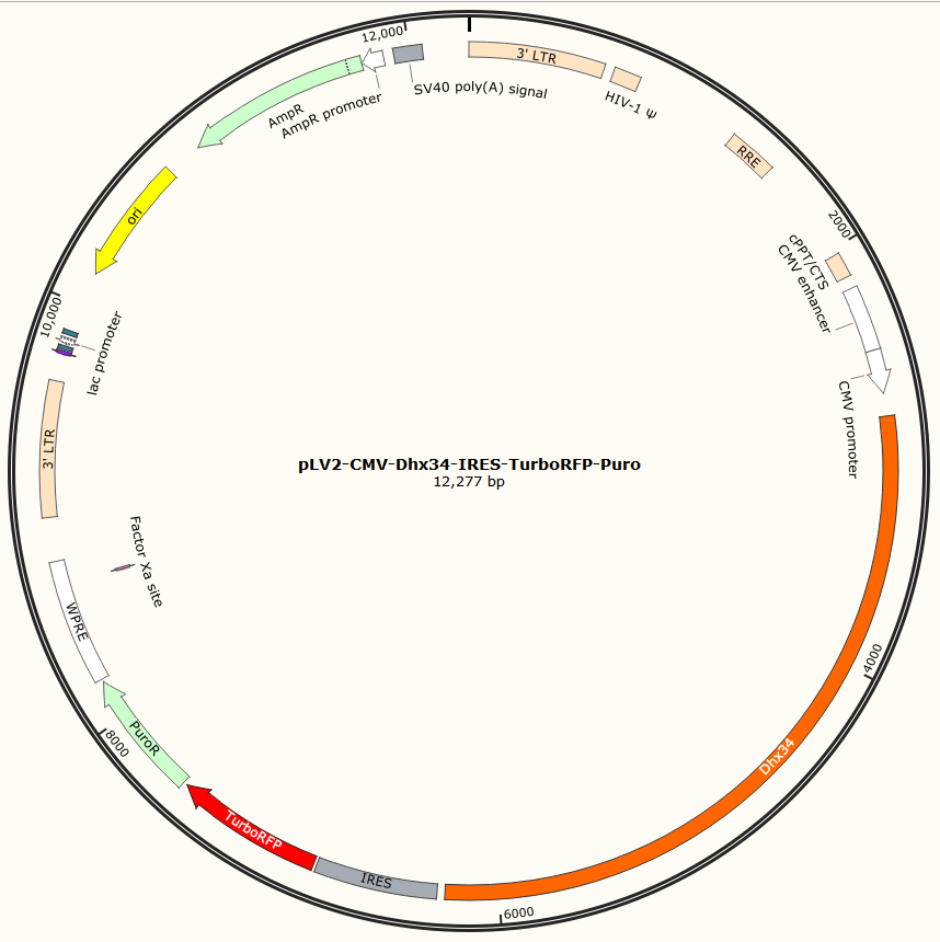 pLV2-CMV-Dhx34-IRES-TurboRFP-Puro是以基恩科生物自研慢病毒骨架载体pLV2-CMV-MCS-IRES-TurboRFP-Puro为骨架载体构建,过表达小鼠Dhx34基因,与载体PMD2.G和Pspax2配套进行慢病毒包装。