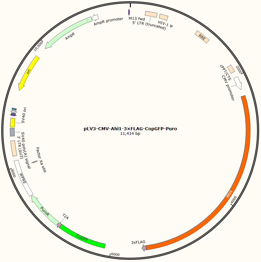 pLV3-CMV-Ahi1-3×FLAG-CopGFP-Puro是以基恩科生物自研慢病毒骨架载体pLV3-CMV-MCS-3×FLAG-CopGFP-Puro为骨架载体构建,过表达小鼠Ahi1基因,与载体PMD2.G和Pspax2配套进行慢病毒包装。
