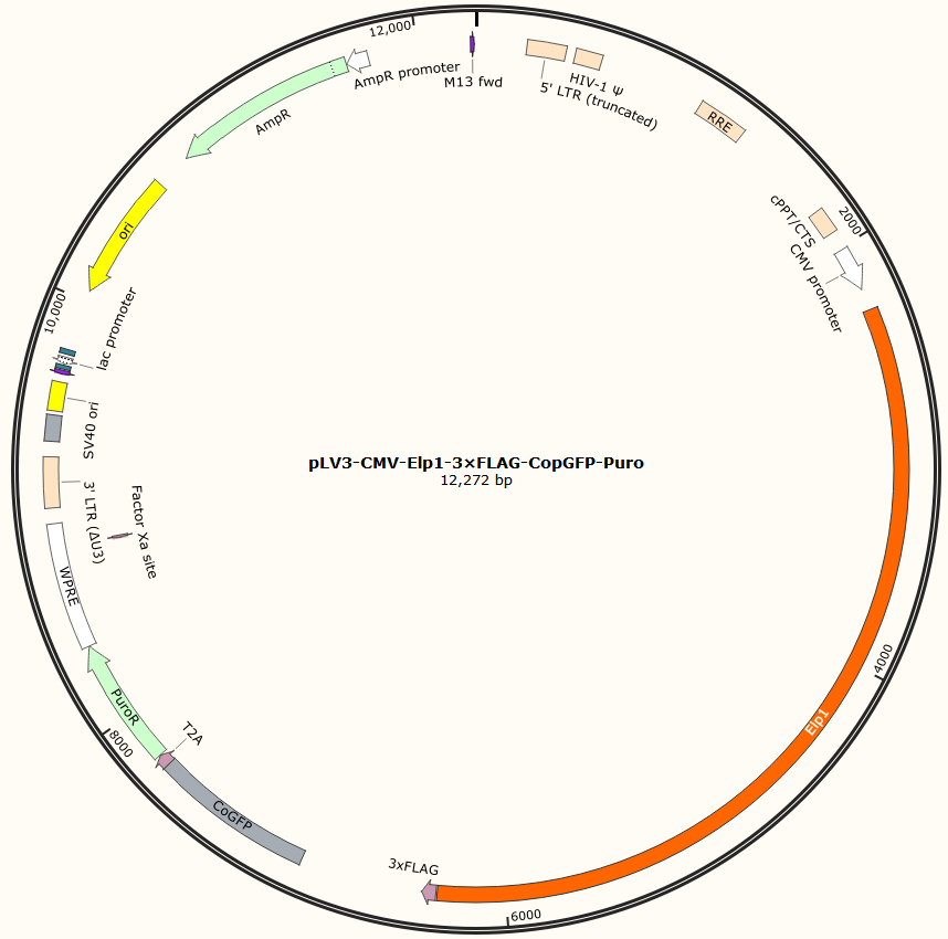 pLV3-CMV-Elp1-3×FLAG-CopGFP-Puro是以基恩科生物自研慢病毒骨架载体pLV3-CMV-MCS-3×FLAG-CopGFP-Puro为骨架载体构建,过表达小鼠Elp1基因,与载体PMD2.G和Pspax2配套进行慢病毒包装。