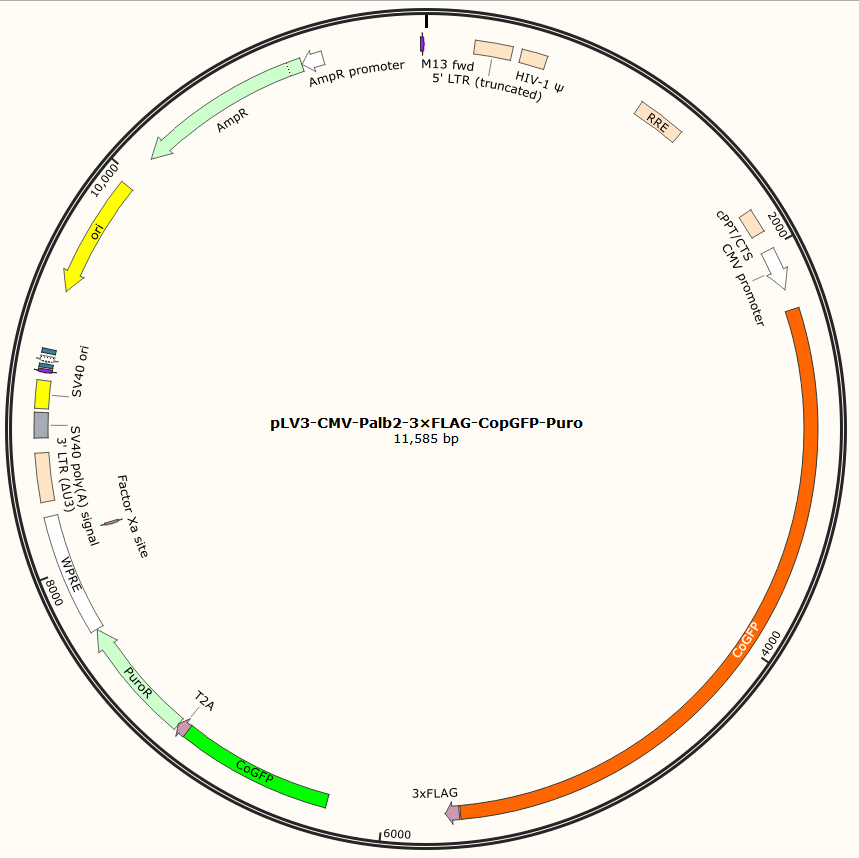 | GC020401145 | pLV3-CMV-Palb2-3×FLAG-CopGFP-Puro | 2μg | Palb2基因过表达 | 800.00 | 2-3天 |