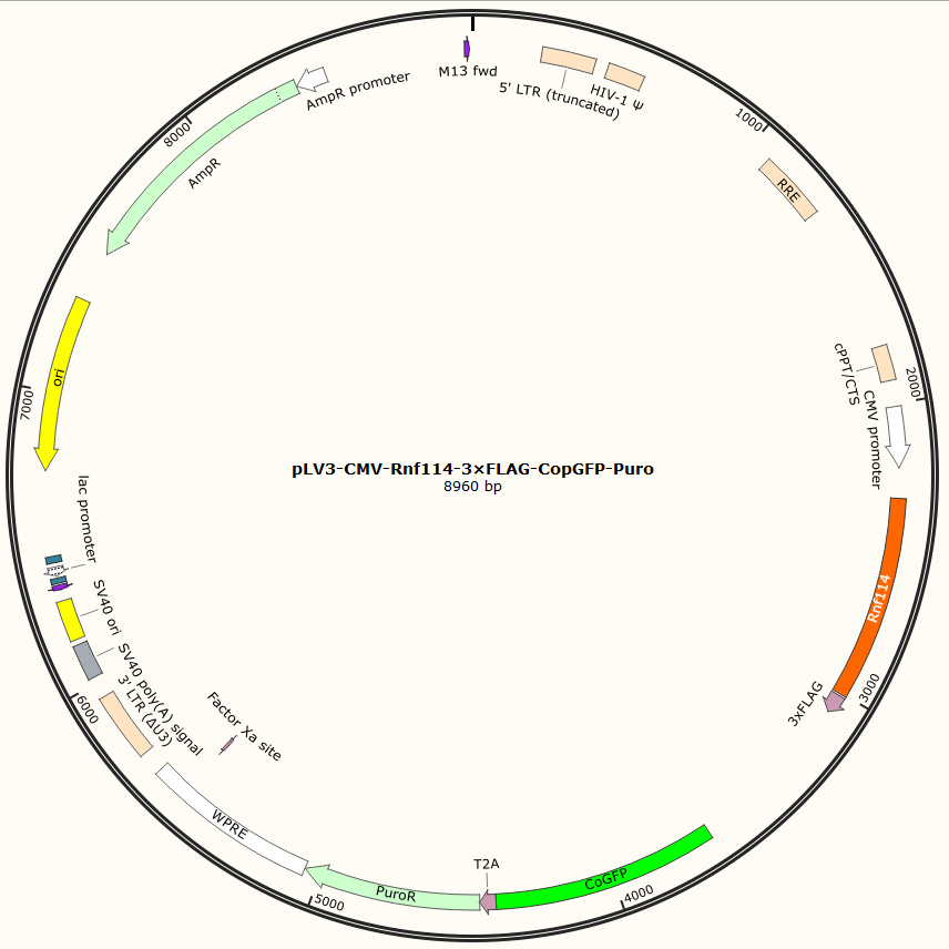 pLV3-CMV-Rnf114-3×FLAG-CopGFP-Puro是以基恩科生物自研慢病毒骨架载体pLV3-CMV-MCS-3×FLAG-CopGFP-Puro为骨架载体构建,过表达小鼠Rnf114基因,与载体PMD2.G和Pspax2配套进行慢病毒包装。