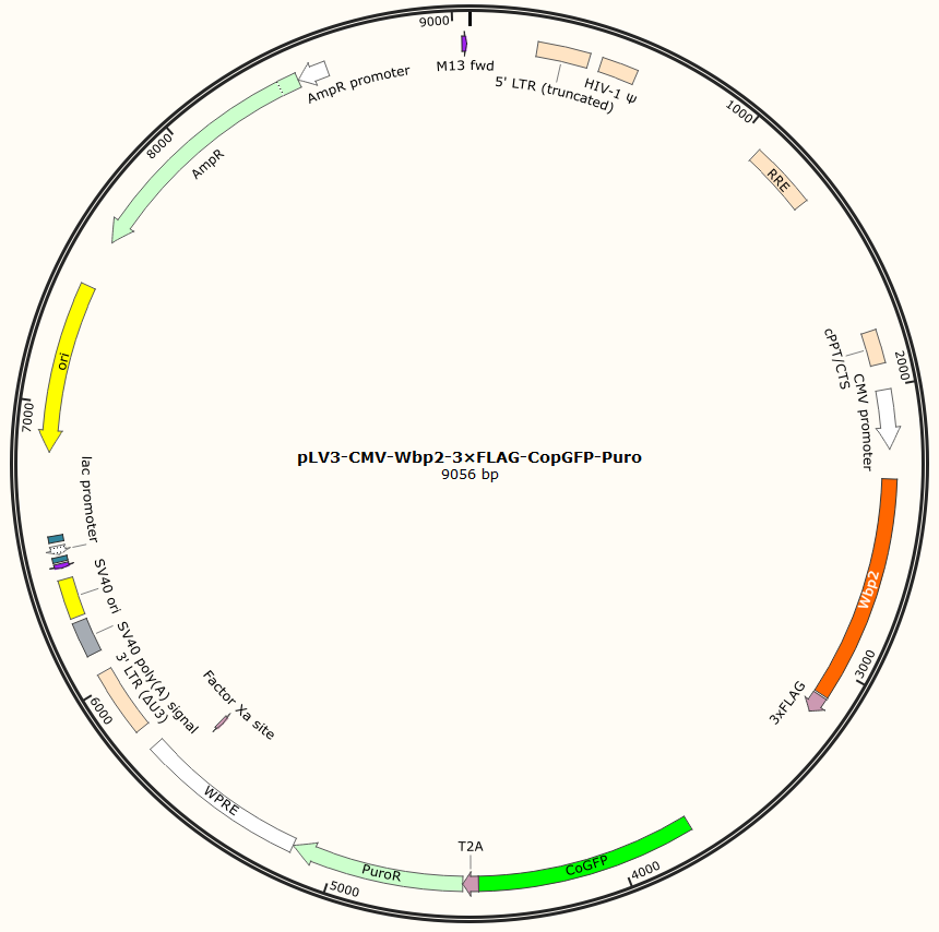 | GC020301155 | pLV3-CMV-Wbp2-3×FLAG-CopGFP-Puro | 2μg | Wbp2基因过表达 | 800.00 | 2-3天 |