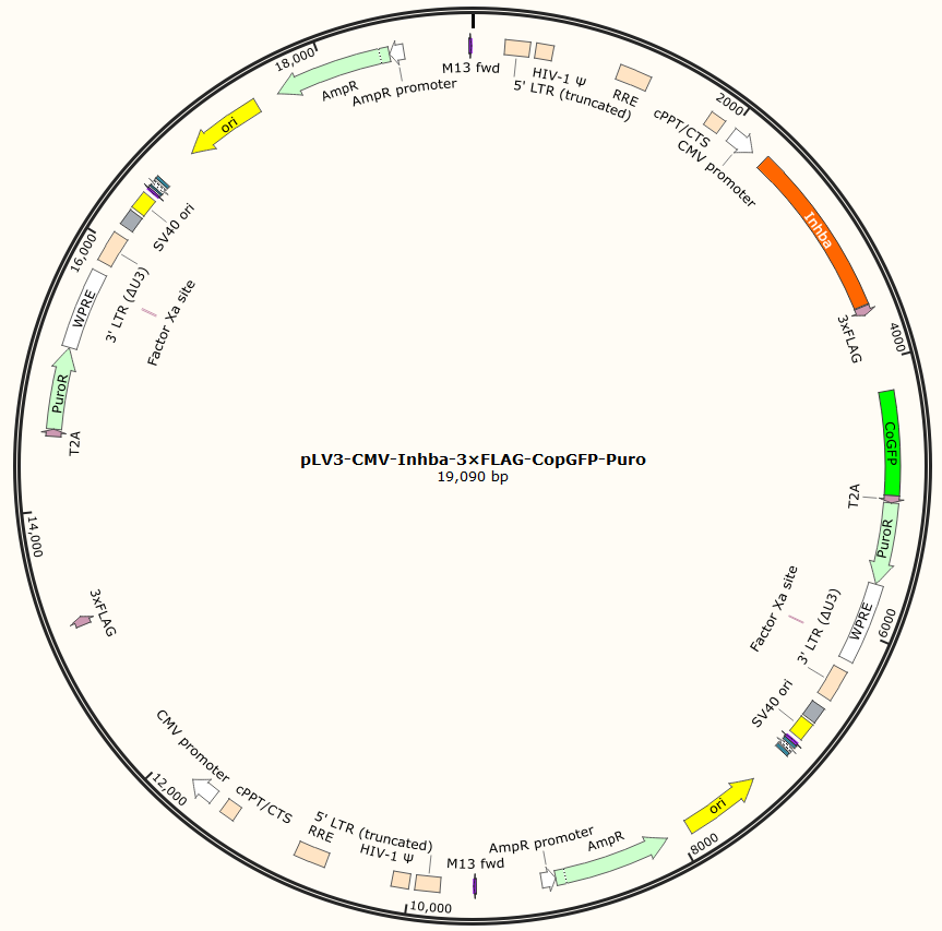 pLV3-CMV-Inhba-3×FLAG-CopGFP-Puro是以基恩科生物自研慢病毒骨架载体pLV3-CMV-MCS-3×FLAG-CopGFP-Puro为骨架载体构建,过表达小鼠Inhba基因,与载体PMD2.G和Pspax2配套进行慢病毒包装。