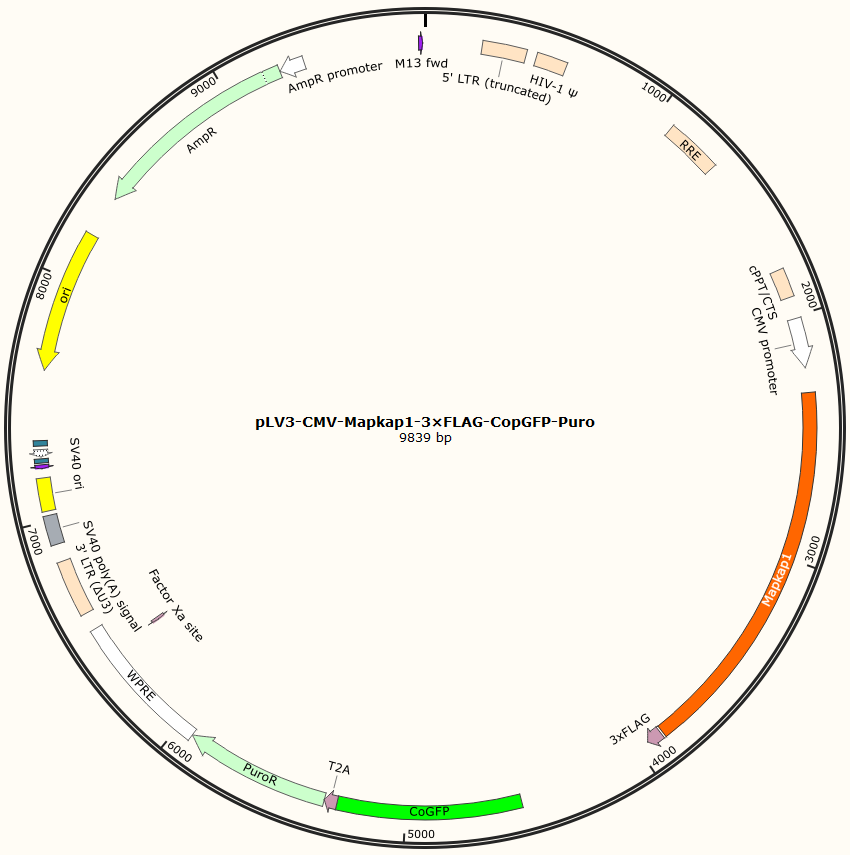 pLV3-CMV-Mapkap1-3×FLAG-CopGFP-Puro是以基恩科生物自研慢病毒骨架载体pLV3-CMV-MCS-3×FLAG-CopGFP-Puro为骨架载体构建,过表达小鼠Mapkap1基因,与载体PMD2.G和Pspax2配套进行慢病毒包装。
