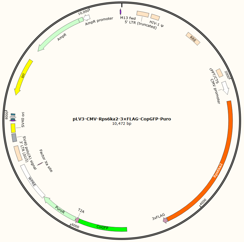 pLV3-CMV-Rps6ka2-3×FLAG-CopGFP-Puro是以基恩科生物自研慢病毒骨架载体pLV3-CMV-MCS-3×FLAG-CopGFP-Puro为骨架载体构建,过表达小鼠Rps6ka2基因,与载体PMD2.G和Pspax2配套进行慢病毒包装。