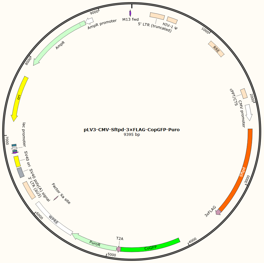 pLV3-CMV-Sftpd-3×FLAG-CopGFP-Puro是以基恩科生物自研慢病毒骨架载体pLV3-CMV-MCS-3×FLAG-CopGFP-Puro为骨架载体构建,过表达小鼠Sftpd基因,与载体PMD2.G和Pspax2配套进行慢病毒包装。
