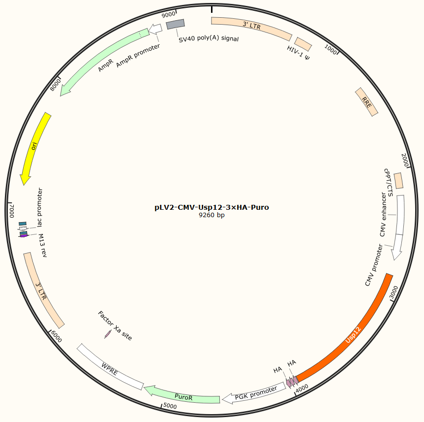 pLV2-CMV-Usp12-3×HA-Puro是以基恩科生物自研慢病毒骨架载体pLV2-CMV-Usp12-3×HA-Puro为骨架载体构建,过表达小鼠Usp12基因,与载体PMD2.G和Pspax2配套进行慢病毒包装。