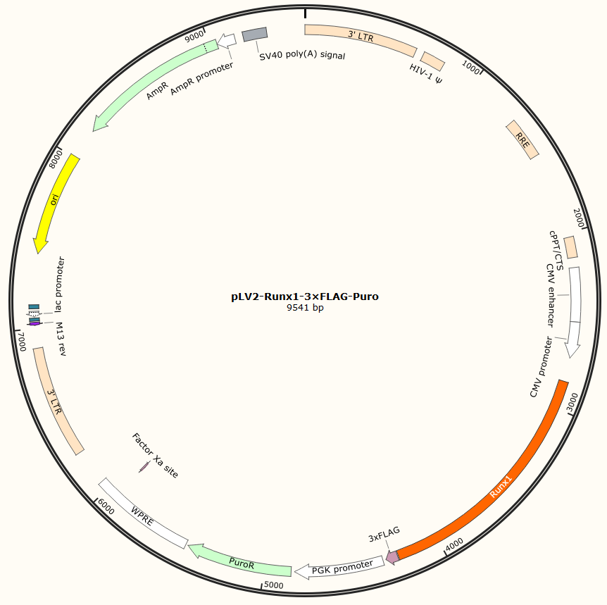 pLV2-Runx1-3×FLAG-Puro是以基恩科生物自研慢病毒骨架载体pLV2-MCS-3×FLAG-Puro为骨架载体构建,过表达小鼠Runx1基因,与载体PMD2.G和Pspax2配套进行慢病毒包装。