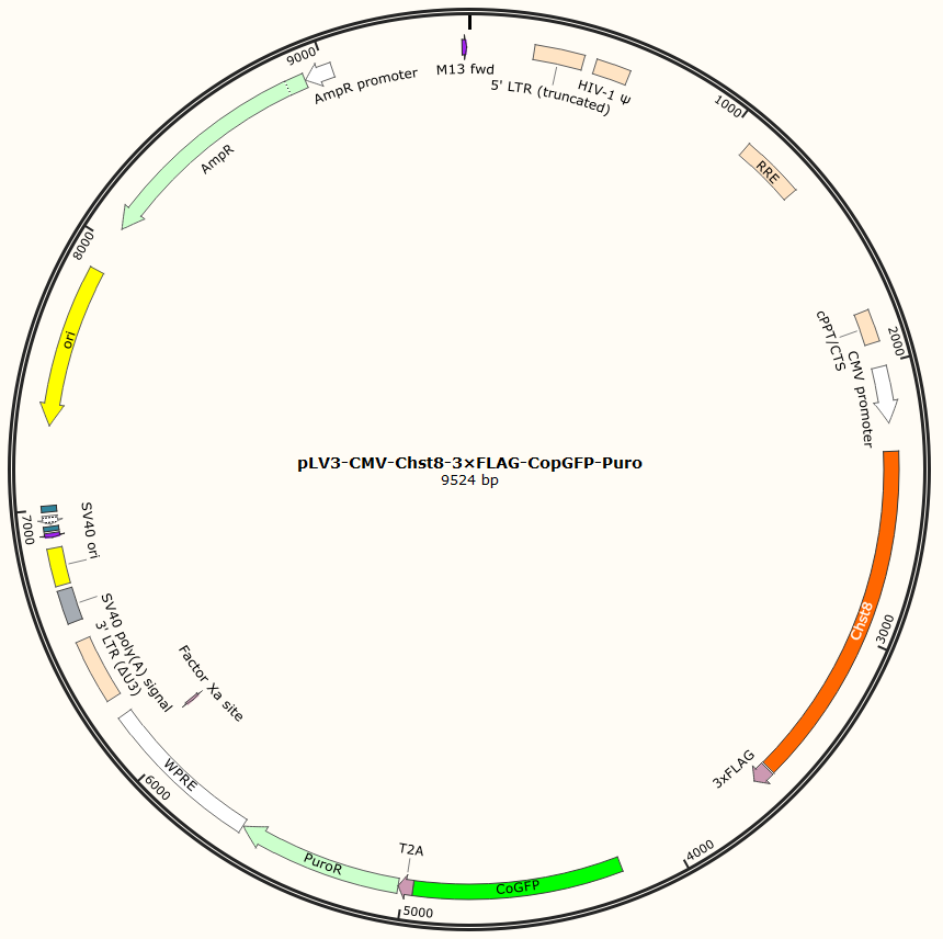 pLV3-CMV-Chst8-3×FLAG-CopGFP-Puro是以基恩科生物自研慢病毒骨架载体pLV3-CMV-MCS-3×FLAG-CopGFP-Puro为骨架载体构建,过表达小鼠Chst8基因,与载体PMD2.G和Pspax2配套进行慢病毒包装。