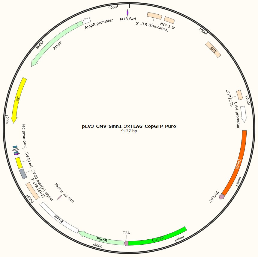 pLV3-CMV-Smn1-3×FLAG-CopGFP-Puro是以基恩科生物自研慢病毒骨架载体pLV3-CMV-MCS-3×FLAG-CopGFP-Puro为骨架载体构建,过表达小鼠Smn1基因,与载体PMD2.G和Pspax2配套进行慢病毒包装。