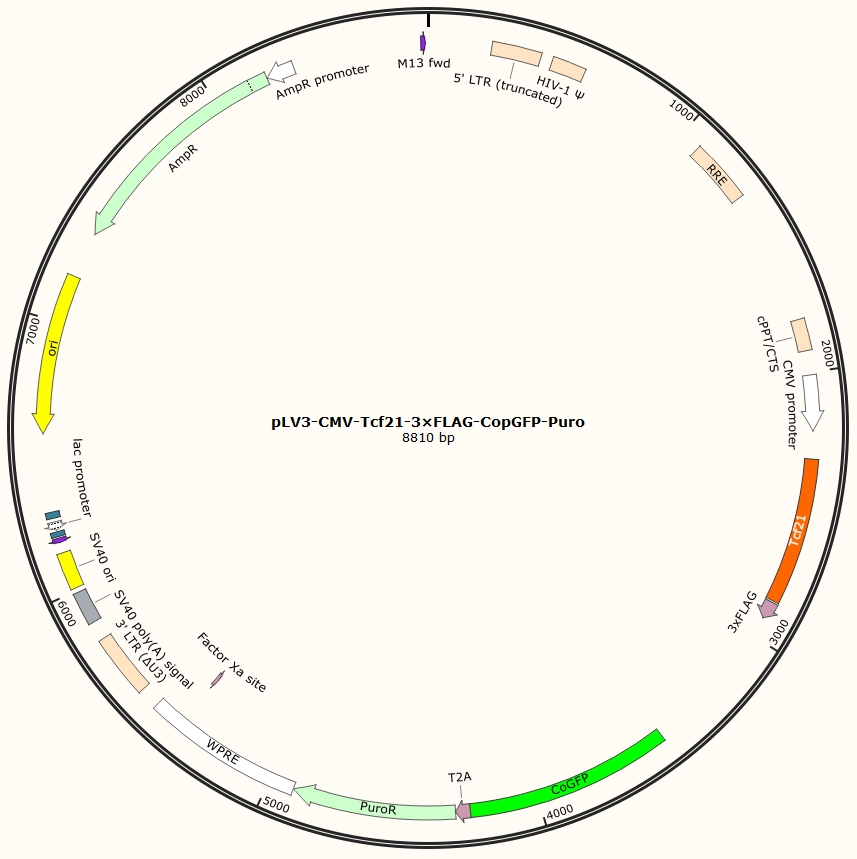 pLV3-CMV-Tcf21-3×FLAG-CopGFP-Puro是以基恩科生物自研慢病毒骨架载体pLV3-CMV-MCS-3×FLAG-CopGFP-Puro为骨架载体构建,过表达小鼠Tcf21基因,与载体PMD2.G和Pspax2配套进行慢病毒包装。