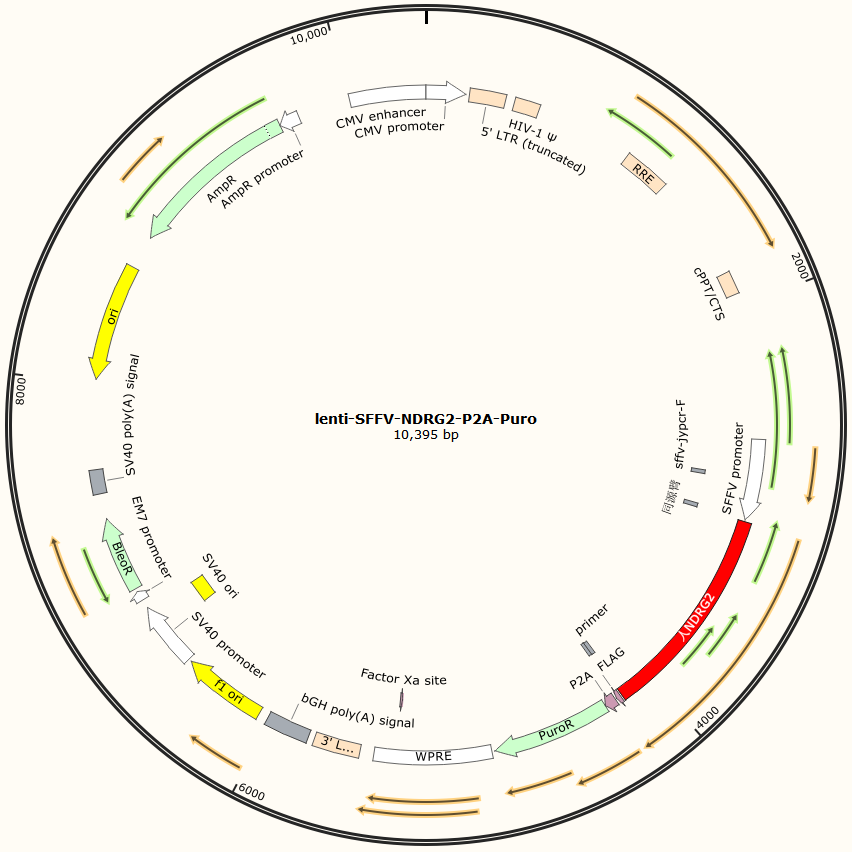 lenti-SFFV-NDRG2-P2A-Puro是以基恩科生物自研慢病毒骨架载体plenti-SFFV-MCS-puro为骨架载体构建,过表达人NDRG2基因,与载体PMD2.G和Pspax2配套进行慢病毒包装。
