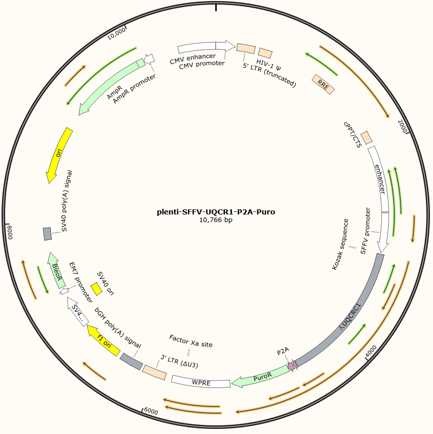 plenti-SFFV-UQCR1-P2A-puro是以基恩科生物自研慢病毒骨架载体plenti-SFFV-MCS-puro为骨架载体构建,过表达人UQCR1基因,与载体PMD2.G和Pspax2配套进行慢病毒包装。