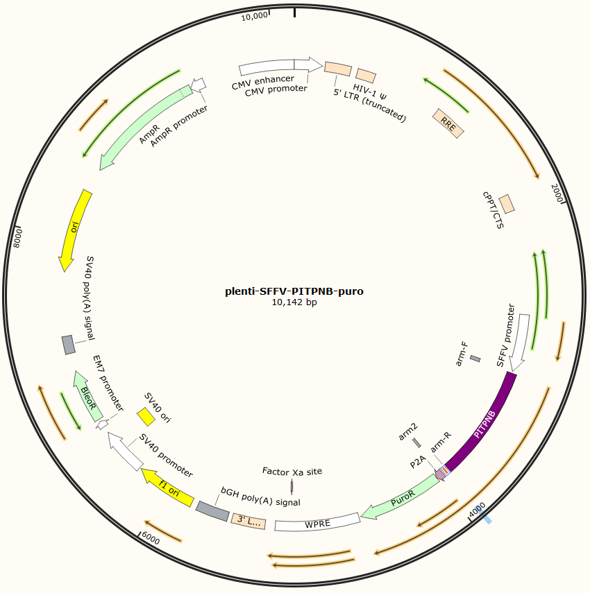 plenti-SFFV-PITPNB-Puro是以基恩科生物自研慢病毒骨架载体plenti-SFFV-MCS-puro为骨架载体构建,过表达人PITPNB基因,与载体PMD2.G和Pspax2配套进行慢病毒包装。