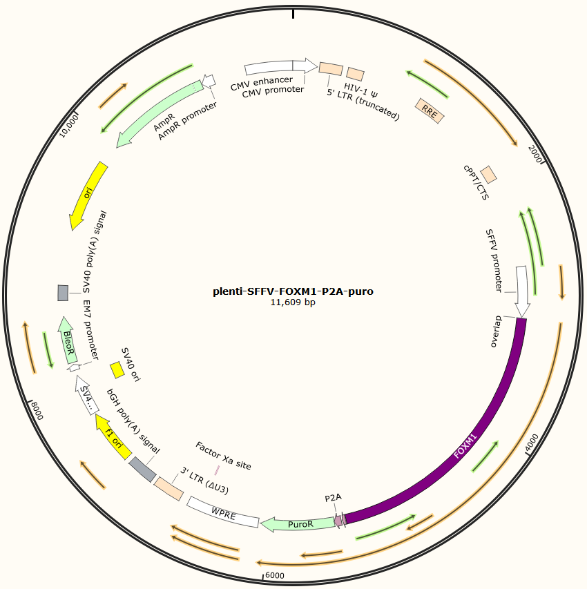 lenti-SFFV-Foxm1-Puro是以基恩科生物自研慢病毒骨架载体plenti-SFFV-MCS-puro为骨架载体构建,过表达人Foxm1基因,与载体PMD2.G和Pspax2配套进行慢病毒包装。