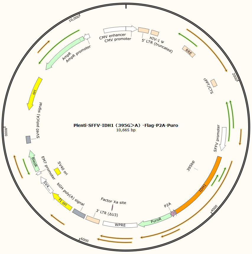 Plenti-SFFV-IDH1(395G>A)-Flag-P2A-Puro是以基恩科生物自研慢病毒骨架载体plenti-SFFV-MCS-puro为骨架载体构建,过表达人IDH1基因,并做点突变,与载体PMD2.G和Pspax2配套进行慢病毒包装。