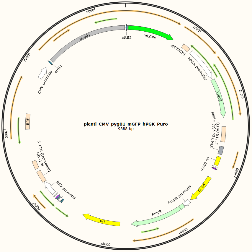 plenti-CMV-pyg01-mGFP-hPGK-Puro是以基恩科生物自研慢病毒骨架载体plenti-CMV-MCS-mGFP-hPGK-Puro为骨架载体构建,过表达人pyg01基因,与载体PMD2.G和Pspax2配套进行慢病毒包装。