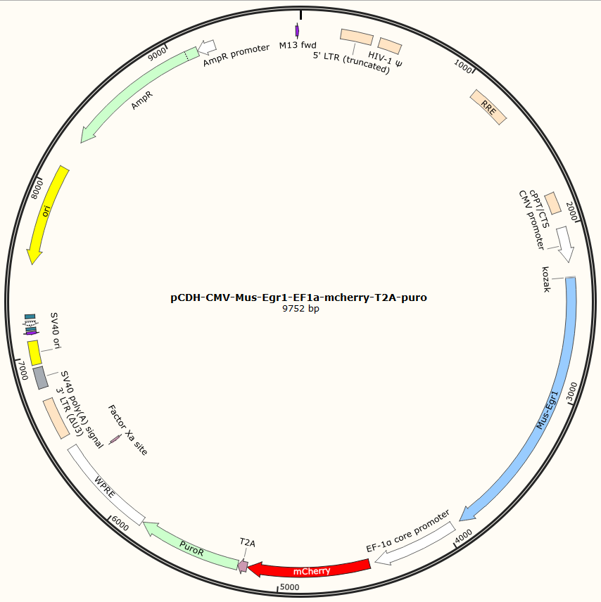 pCDH-CMV-Egr1-EF1a-mcherry-T2A-puro 是以基恩科生物自研慢病毒骨架载体pCDH-CMV-MCS -EF1a-mcherry-T2A-puro为骨架载体构建,过表达小鼠Egr1基因,与载体PMD2.G和Pspax2配套进行慢病毒包装。